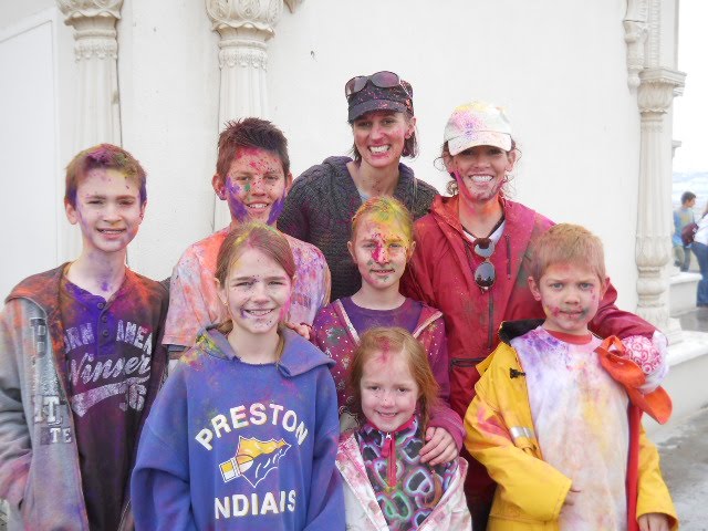 Today was the Hare Krishna Holi Festival of Colors...a celebration of spring! Here is part of our group "before". I'm in the black hat.