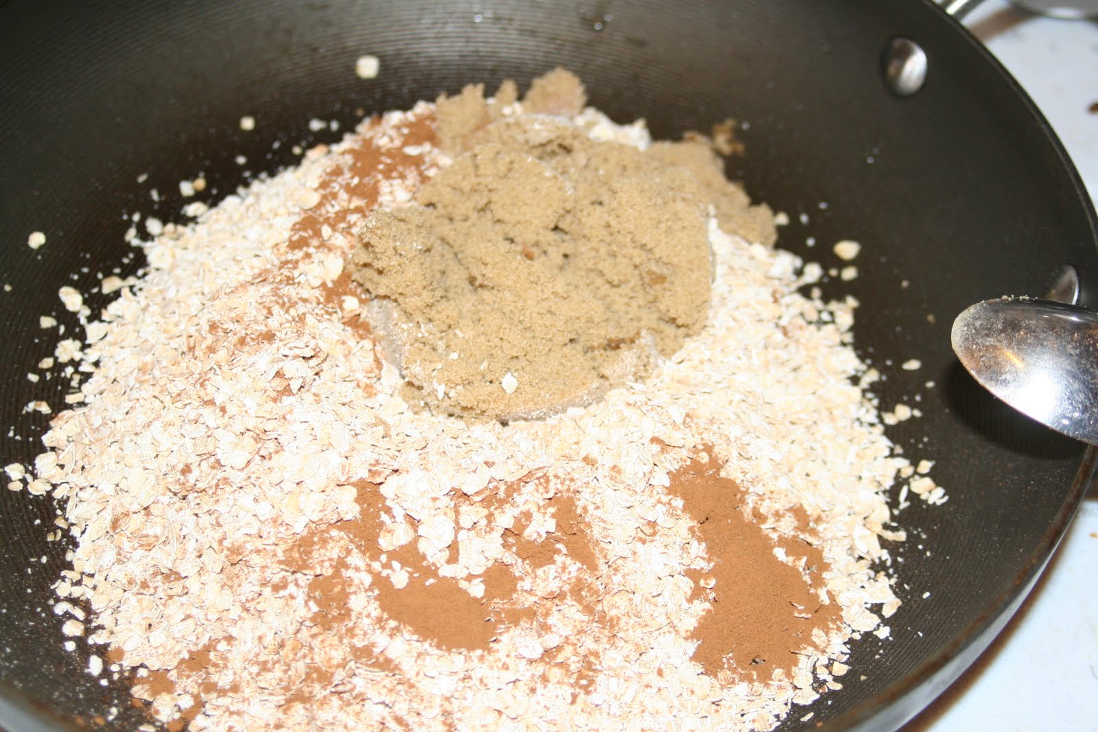 How to turn Oats, Cinnamon, Brown Sugar, and Caramel sauce into yummy. yummy, granola!