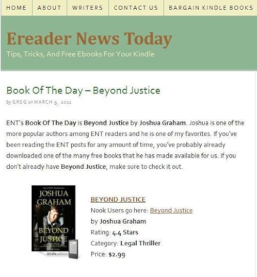 I've got to thank the wonderful people at Ereadernewstoday.com for featuring BEYOND JUSTICE as their book of the day today. This blog site has introduced tons of free and bargain ebooks to thousands of people. In the past couple of months they've featured many of my Free Friday ebooks.