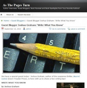 Joshua Graham makes a guest blogger appearance at As The Pages Turn and discusses the age old topic of "Write What You Know." He discusses living in San Diego, and other places in the world he's visited/lived.