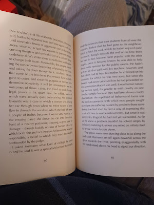 "So I read [Thomas Bernhard's] Extinction very slowly indeed, and did most of that reading in the toilet cubicle at work. Most thinking and much else at work must be done in toilet cubicles. Toilet cubicles are about the only place where thinking can happen, I thought, where the association between thinking and [elimination] seemed entirely appropriate to my deplorable state of mind. It was unbearable to read a book like Extinction slowly. Only so much time can be spent in a toilet cubicle before one leg goes dead, followed by the other. It is easy to spot these toilet cubicle thinkers, I thought. They walk around with one dead leg from too much sitting on the pot. They think for the amount of time it takes for one leg to go dead, I thought, but not the other. Being habitual toilet cubicle thinkers, they leave the cubicle before the second leg goes dead so that they have one leg to hobble with. Becoming an experienced cubicle thinker myself, I only read Extinction in one-leg sittings."