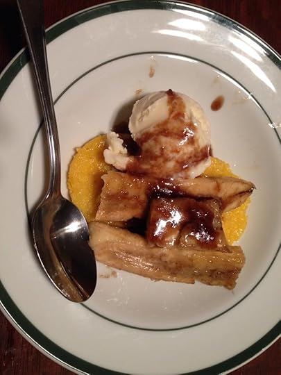I had some leftover plain polenta I needed to use up, so I cut it into rounds and sauteed it in butter to use as a base for the bananas foster and frozen yogurt. It was a good idea, but I cut the polenta a little too thick, and I probably should've sweetened it a bit when cooking instead of counting on the sauce and frozen yogurt to provide all the sugar needed. Still, on the whole, this was a quick, delicious dessert which I will make again.