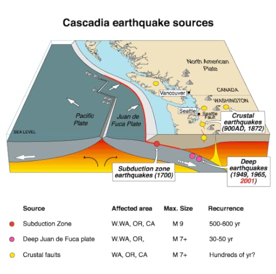 I moved to Seattle from the all but seismically dormant eastern half of the country in 1999 (grew up in Alabama, spent a good chunk of my 20's in Philadelphia), and experienced my first earthquake, the 6.8 Nisqually quake, in early 2001. It was scary, for sure, but did relatively light damage for its magnitude because its epicenter was so deep. We get that type of high-6/low-7 magnitude quake every few decades here, and up until very recently scientists thought that was the worst the Northwest had to worry about.