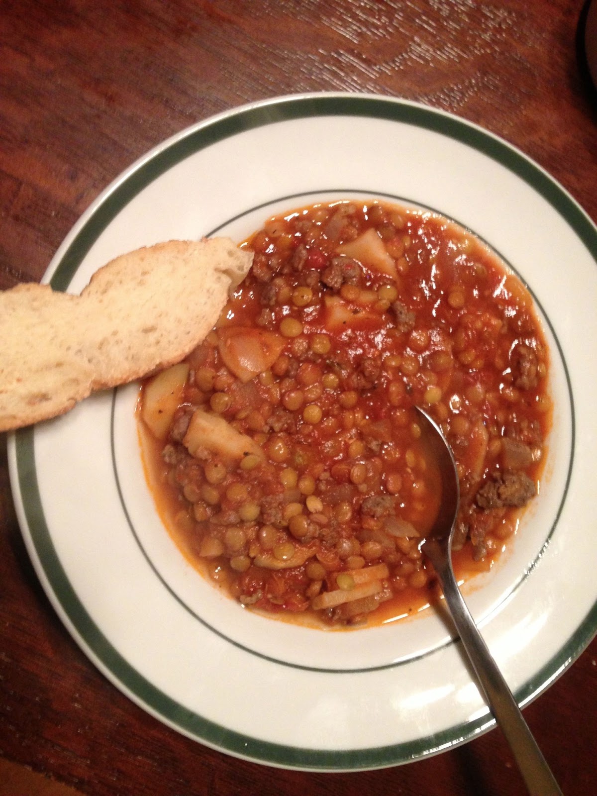 Add remaining ingredients, including browned sausage. Simmer 30 minutes or until tender. Serve with bread. (The recipe suggests placing a bread slice in each bowl and pouring soup over bread, but I decided I'd rather have it on the side.)