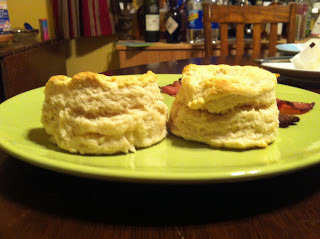 They smelled like my mom's biscuits, to the point I was carried off on a wave of memories just from the scent of the dough. They tasted like them, too, pretty much. Unfortunately, they were also heavy. Bricklike, even, though Mr Fraser ate them happily enough and Miss Fraser the Finicky wants to know when I'm making them again.