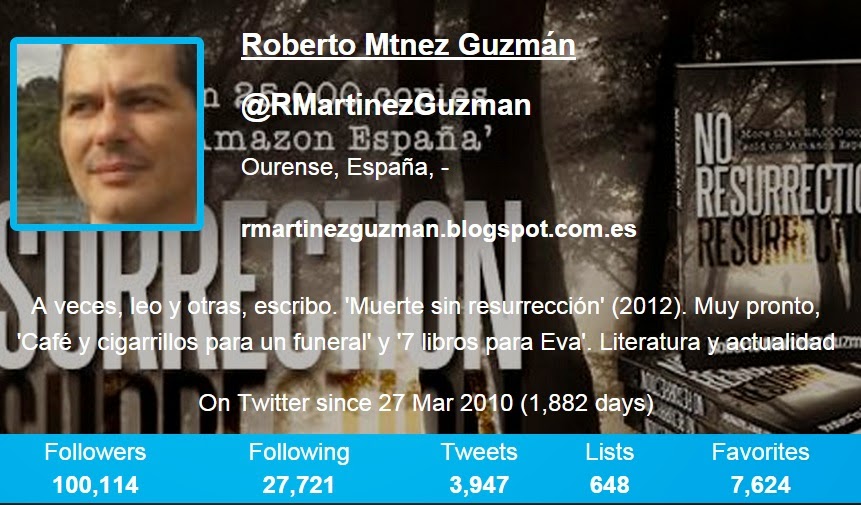 - He acabado de de escribir una nueva novela "Café y cigarrillos para un funeral" que se podrá leer el mes próximo dentro de un proyecto literario del que os hablaré muy pronto.- Estoy ultimando "7 libros para Eva" que saldrá antes de que acabe el año seguro.- He abierto y puesto a rodar un perfil en Twitter en inglés que funciona mucho mejor de lo que esperaba en un principio.- Y, por último y que me acuerde ahora mismo, mi otro perfil de Twitter (el que uso desde siempre), ayer ha alcanzado los 100 mil seguidores.