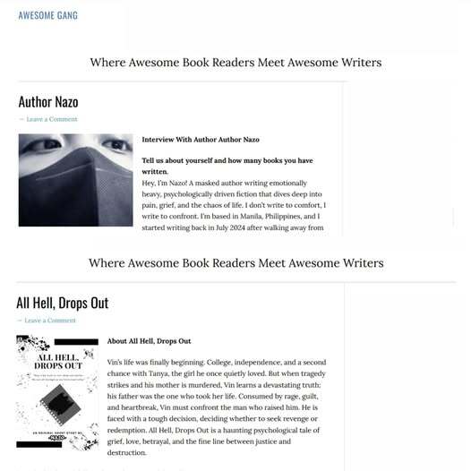 Big shoutout to Awesome Gang for highlighting both All Hell, Drops Out and my author interview. This platform is all about connecting readers with fresh new voices, and I’m honored to be included.