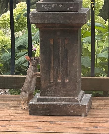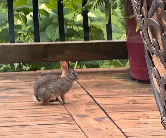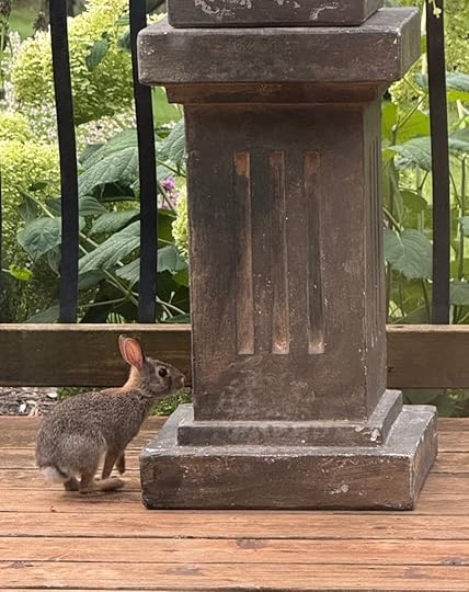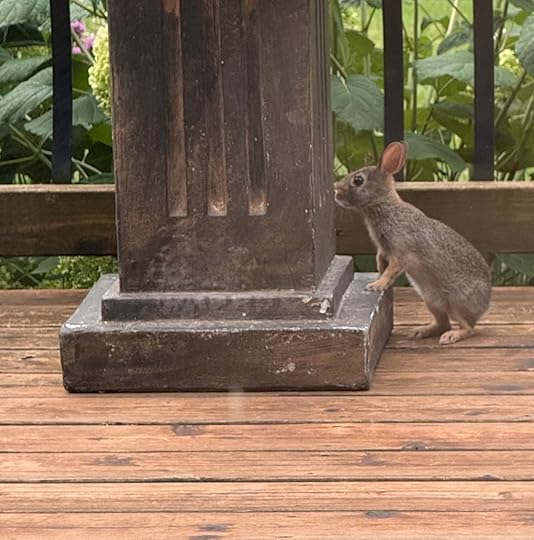 The other day while sitting on the deck I had a visitor. A sweet baby bunny intent on munching on a leafy hunk of geranium, juicy and wet, freshly fallen from the large stone planter thanks to an overnight thunderstorm.