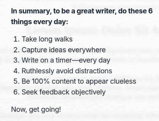 Here’s a summary of his six suggestions. Nothing earth shatteringly new…but I find repetition works because it gooses me along.