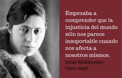 Algo que me gusta mucho y que me sucede de vez en vez, aunque últimamente con mayor frecuencia, es el hecho de descubrir a nuevos autores y autoras, la mayoría de las ocasiones de manera incidental. Hoy me topé sin proponérmelo con la escritora judeofrancesa de origen ucraniano Irène Némirovsky, nacida en Kiev en 1903, educada en San Petersburgo, exiliada junto a su familia en Francia en 1919 -huyeron de la revolución rusa- y asesinada en el campo de concentración nazi de Auschwitz, en Polonia, en 1942, a sus escasos 39 años de edad. Nunca había escuchado hablar de ella y apenas empezaré a leer algo suyo, pero el que especialistas de todo el mundo comparen su obra y su estilo con los de Chejov y Dostoyevski es sobrado motivo para entrar a su mundo como narradora, con novelas como Los bienes de este mundo, Las moscas de otoño, La dramática vida de Anton Chejov o su recién descubierta e inconclusa Suite francesa. Su amplia obra literaria está escrita en francés, pero se le ha traducido a muchas lenguas, entre ellas, claro, el español. A empezar a leerla pues.