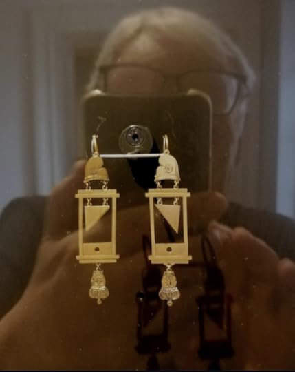 Aretes en forma de guillotina, originales del siglo XVIII. Nótense los gorros frigios arriba y las cabezas del rey Luis XVI que cuelgan abajo. La foto la tomé en el espléndido Museo Carnavalet, dedicado a la historia de París, hoy hace exactamente un año, en el quinto día de viaje por esa ciudad (octubre 15 de 2023).