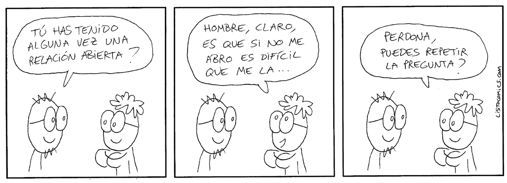 A mi modo de ver, una relación abierta, libre, es aquella en la que los novios, amantes, compañeros –o como se les quiera llamar– viven su amor sin ataduras impuestas por los convencionalismos sociales y, sobre todo, sin sentir y/o creer que la otra persona es de su propiedad. Esa es para mí la gran clave de los infiernos en que suelen convertirse tantas relaciones: el sentido de propiedad privada sobre la otra persona.