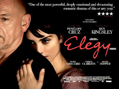 Basada en la novela The Dying Animal (2001) del gran escritor estadounidense Philip Roth, Elegy (dirigida por la realizadora española Isabel Coixet en 2008 y absurdamente "traducida" como La elegida) es una cinta dramática y bella que narra la historia de un intelectual neoyorquino sesentón (el emblemático personaje David Kepesh de Roth), protagonizado por el siempre impecable Ben Kingsley, divorciado años atrás y quien lleva con disciplina su vida de soltero seductor de sus alumnas universitarias, una de las cuales es la cubano-norteamericana Consuela (¿y por qué no Consuelo?), interpretada por la bellísima Penélope Cruz, en un papel más que convincente.Las inseguridades de Kepesh empiezan a relucir cuando se da cuenta de que, contra sus propias reglas y convicciones, se está enamorando de su nueva y joven amante y comienza a verse invadido por los celos y a actuar de la manera ridícula como actúan los celosos. La situación se complica cada vez más, sobre todo porque Consuela también se siente enamorada y busca un compromiso que él rehuye hasta el punto de dejarla plantada el día de su cumpleaños, cuando ella organiza una gran fiesta con la intención de presentar a David con su familia de ricos exiliados cubanos. Todo parece acabar ahí, hasta que una trágica vuelta de tuerca (que no mencionaré) hace que las cosas se vuelquen de manera inesperada y muy triste.