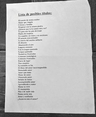 Originalmente, mi novela Matar por Ángela, recientemente reeditada y relanzada por Lectorum, no llevaba ese título sino otro que al buen Sandro Cohen, quien estuvo a punto de editarla con Nueva Imagen, en 1997, no le gustó (el nombre original lo mencionaré en algún momento, no por ahora). "Cámbiale el título y el final y te la publico", me dijo el querido Sandro. Le llevé entonces una larga lista de nombres posibles, en su mayoría malísimos, entre ellos el que definitivamente tuvo y con el cual se conoce. También le cambié el final, por cierto, y quedó mucho mejor que el muy previsible que tenía.Esta es la lista de los títulos que le propuse a Cohen (se vale reírse):