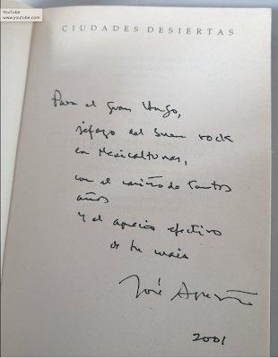 En 2001, mi muy querido José Agustín me puso esta dedicatoria en mi ejemplar de Ciudades desiertas ("Para el gran Hugo, jefazo del buen rock en Mexicaltunas, con el cariño de tantos años y el aprecio efectivo de tu cuais José Agustín". Nos conocemos desde hace más de 50 años (por allá de 1969), cuando él vivía en la colonia Del Valle y mi hermano Sergio, muy cuate de Agustín, iba a visitarlo y me llevaba con él.