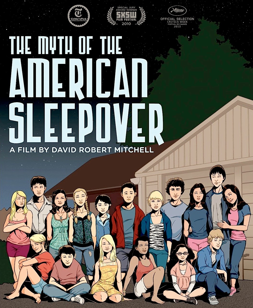 Independiente e hiperrealista, The Myth of the American Sleepover de David Robert Mitchell (2010) es un filme que muestra un retrato de la aburrida realidad de un grupo de jóvenes de los suburbios de Detroit, a lo largo de la última noche de verano antes de ingresar a sus nuevas escuelas o a la universidad, noche en la que se revientan, deambulan, conversan, se seducen, sueñan, sufren. Mitchell trata la historia con una mirada neutra y casi documental, lo cual la hace ciertamente muy interesante y aunque tiene influencias de la enorme American Graffiti de George Lucas (1973), el tono es mucho menos humorístico y desatado y mucho más, digamos, naturalista.Sin actores conocidos, la película narra varias historias que se entrecruzan de manera constante y entre las que destacan la de las dos chavitas "feas" (o poco agraciadas, aun cuando una de ellas no lo es tanto) que buscan aventura en el faje y el alcohol, la del chavo tímido que se obsesiona con una niña rubia hasta que logra dar con ella y tener la oportunidad de besarla, cosa que de pronto se niega a hacer, o la del dieciochoañero que se reencuentra con unas preciosas hermanas gemelas a quienes conociera años atrás y que lo ponen en un predicamento sexual.