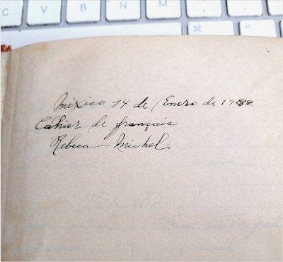 Me encontré esta libreta que usaba mi mamá cuando estudiaba en la Alianza Francesa en 1938, a sus 16 eneros recién cumplidos. Faltaban dos años aún para que conociera a mí papá. Aquí la primera página con su letra.