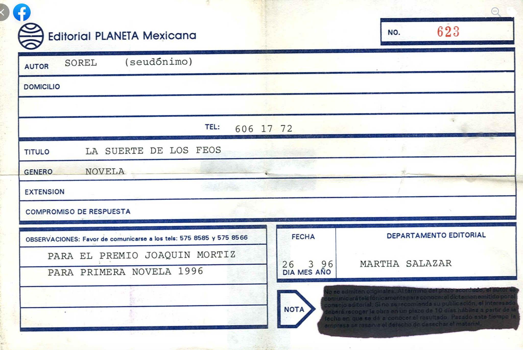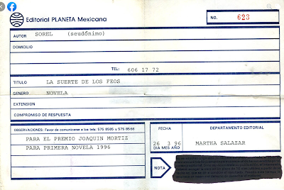 que ahora es el nombre de la novela que tengo inédita y que espero pronto publicar), para el concurso de Primera Novela que organizó Editorial Planeta en 1996. Sé que quedé entre los diez primeros lugares y algún día contaré lo que uno de los jueces me reveló muchos años después, acerca de que pude haber ganado pero -según me dijo- había consigna "desde arriba" para que ganara otra (la cual, sí, ganó). Curioso, la fecha del comprobante es del día que cumplí 41 años de edad.