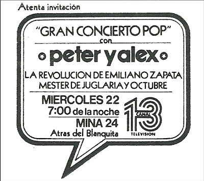 de Canal 13, cuando este pertenecía al gobierno (creo que aún no se llamaba Imevisión) y sus instalaciones estaban en la calle de Mina, cerca del Teatro Blanquita. El dueto de dos guitarras y dos voces se llamaba Octubre y cantamos tres canciones mías ("Elevación", "Tiempo de revolución" y "Soy un director"). El programa, por cierto, lo dirigió Luis de Llano Macedo. Su padre, Luis de Llano Palmer, era el director del 13. Por ahí tengo medio perdido un cassette con la grabación en audio de aquella emisión. La imagen es la de una especie de invitación para la grabación del programa, con el elenco musical que participó. Hace 46 años (y poco más de un mes) de esto (yo iba a cumplir los 20 y Adolfo tenía 17).