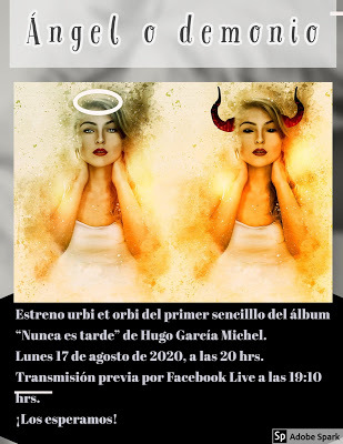 Queda hecha la invitación para que escuchen "Ángel o demonio" a partir de las ocho de la noche de este lunes. Antes, a las 7:10 horas, habrá un streaming en directo por Facebook, para platicar cómo se gestó la canción, cómo fue la grabación y algunas sabrosas anécdotas alrededor del tema. Los esperamos en la transmisión.