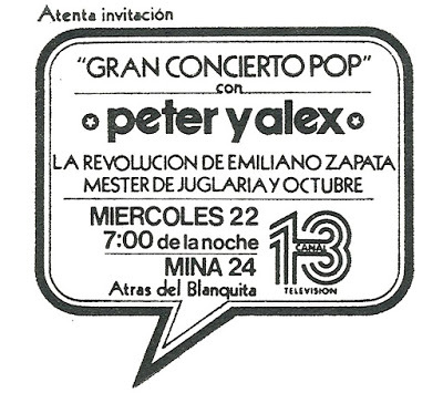 de Canal 13, cuando este pertenecía al gobierno (creo que aún no se llamaba Imevisión) y sus instalaciones estaban en la calle de Mina, cerca del Teatro Blanquita. El dueto de dos guitarras y dos voces se llamaba Octubre y cantamos tres canciones mías ("Elevación", "Tiempo de revolución" y "Soy un director"). El programa, por cierto, lo dirigió Luis de Llano Macedo. Su padre, Luis de Llano Palmer, era el director del 13. Por ahí tengo medio perdido un cassette con la grabación en audio de aquella emisión. La imagen es la de una especie de invitación para la grabación del programa, con el elenco musical que participó. Hace 45 años de esto (yo iba a cumplir los 20 y Adolfo tenía 17).
