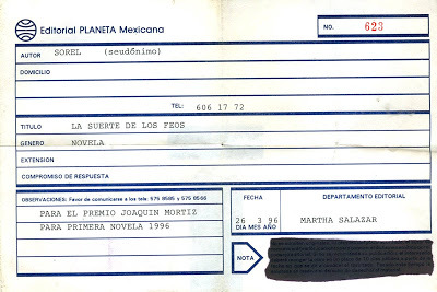 que ahora es el nombre de la novela que tengo inédita y que espero pronto publicar), para el concurso de Primera Novela que organizó Editorial Planeta en 1996. Sé que quedé entre los diez primeros lugares y algún día contaré lo que uno de los jueces me reveló muchos años después, acerca de que pude haber ganado pero –según me dijo– había consigna "desde arriba" para que ganara otra (la cual, sí, ganó). Curioso, la fecha del comprobante es del día que cumplí 41 años de edad.