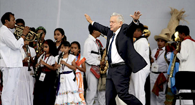 El “evento” fue largo y cansino y tuvo como punto culminante no el prolongado y aburridísimo discurso presidencial, en el que López informó de sus “grandes” logros, sino un extraño acto en el cual un grupo musical de algún “pueblo originario” (el nuevo y políticamente correcto eufemismo para referirse a los indígenas) bailó y tocó sus instrumentos de viento y percusión alrededor del presidente y su esposa, quienes al quedar dentro del círculo humano se notaron desconcertados y no supieron cómo reaccionar. Busque usted el video, es muy divertido.
