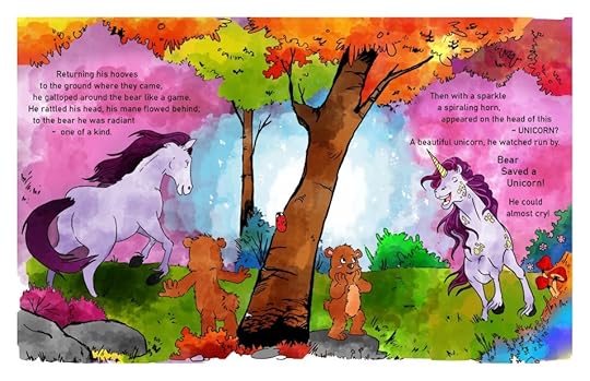 Two-Page spread out of the book “The First Unibear” by author Kathleen J. Shields So go ahead and place your Pre-Order for UNIBEAR Today!Yes, Amazon shows the hardback book as “Temporarily out of stock” instead of a pre-order like the e-book, that is technically true, nothing is available yet – not until September 28th. But don’t let that deter you. On September 28th, when your order is processed, that book will be printed and shipped to you within a couple days of your order.