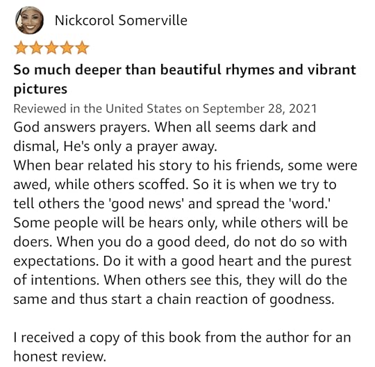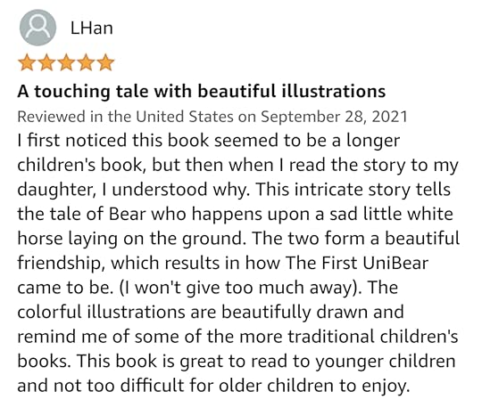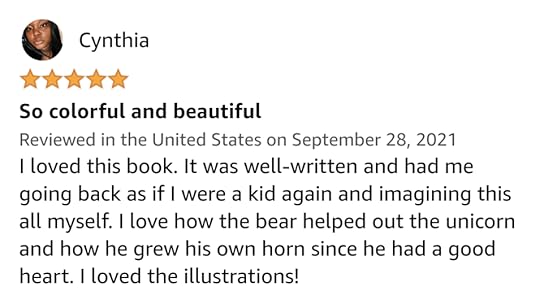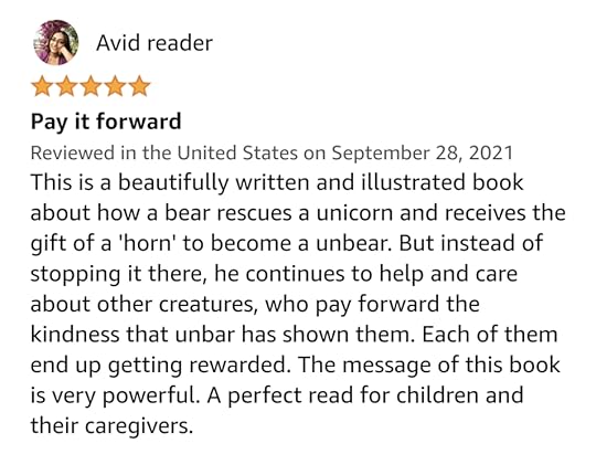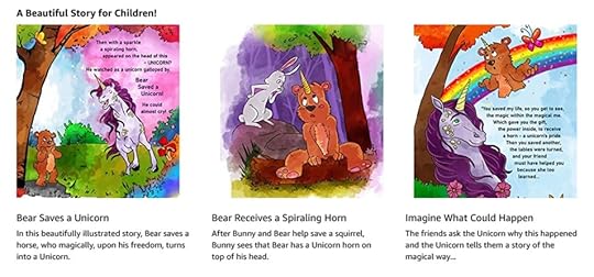 A tiny bear follows a butterfly into the woods where he sees a horse that needs help. After helping the horse, he discovers it is actually a unicorn! The unicorn tells the bear that now he will be able to see other unicorns. Bear tells his friends and one bunny becomes his best friend. One day the two see a baby squirrel in danger and they both jump in to help. After they saved the squirrel, bunny sees a unicorn horn on bear’s head. The race to find the unicorn and find out why. He explains how the magic can spread when good souls help others. This story is written in rhyme and encourages the reader to do good deeds and help others in need. There is also scripture from the KJV that mentions unicorns.