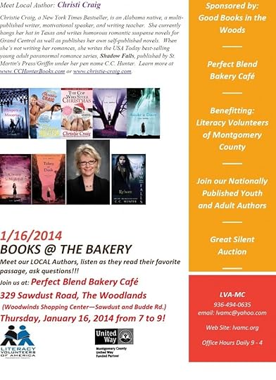 This Thursday I’m doing something really fun. I’m coming together with a bunch of writers to raise money for the Literacy Volunteers of Montgomery County. I don’t know about you, but as a reader, the idea of not being able to read and to lose myself in book, in someone else’s world, would be catastrophic. So I love donating to literacy organizations who help others learn to read so they can discover this amazing past time. And I have to admit, I also love getting together with other writers. These gals are friends that I’ve known a long time, but because most of us live on opposite sides of this huge place referred to as Houston, we don’t get to visit very much. So it will be special to spend some girl-time with them.