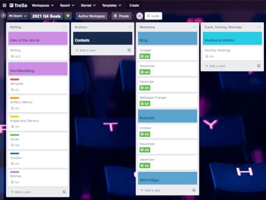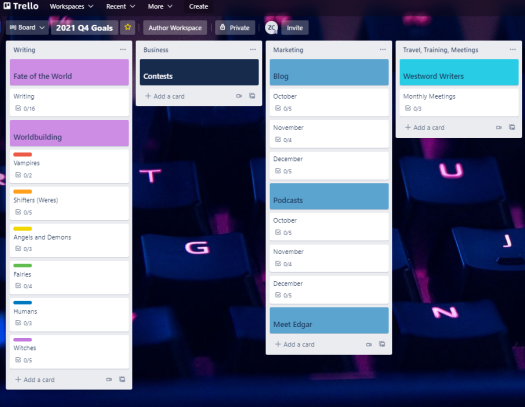 Here we are back at the Kanban-style Trello Board. If you’ve been here a while, you’ll already be familiar with this, but for those that aren’t, I use Trello as a digital sort of Kanban board. I still have categories for my tasks, but I don’t use the “to do, doing, done” modifiers. They all just stay on their lists and I modify the cards within them ...