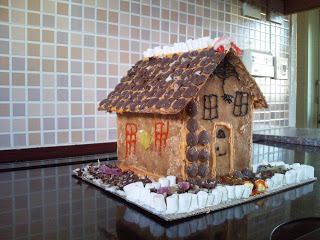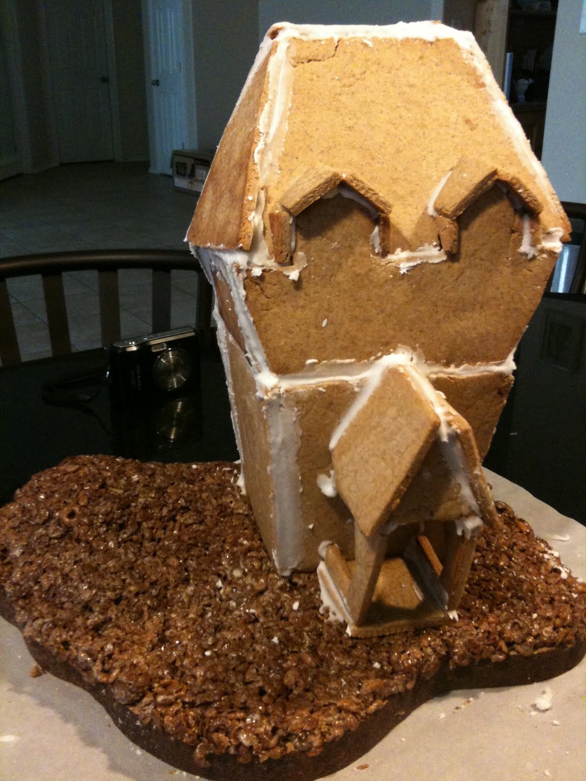 This is naked gingerbread. AKA, the assembled, but still undecorated house. This year, it sits on a "fall lawn" made of chocolate rice crispy treat, molded to the custom wooden platform. There's a tree, but it's not assembled yet. I'm holding my breath on the tree this year, because it looks kinda fragile. I'll post more pictures when the whole thing is done.