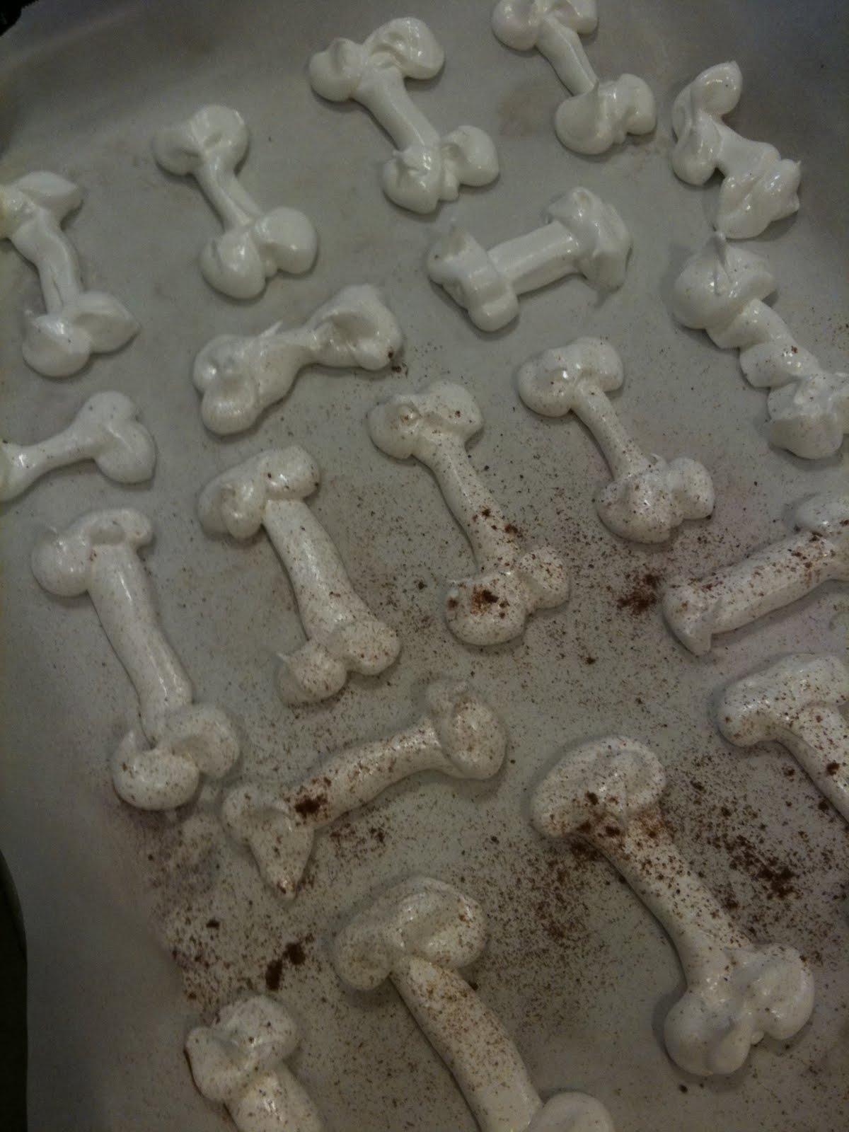 I got the meringue bones recipe here, but I forgot to take a picture of them baked, and now they're all gone! They taste like a cross between cotton candy and toasted marshmallows--so good! And they melt in your mouth, after the initial crunch. I'm making some meringue ghosts this afternoon. ;)