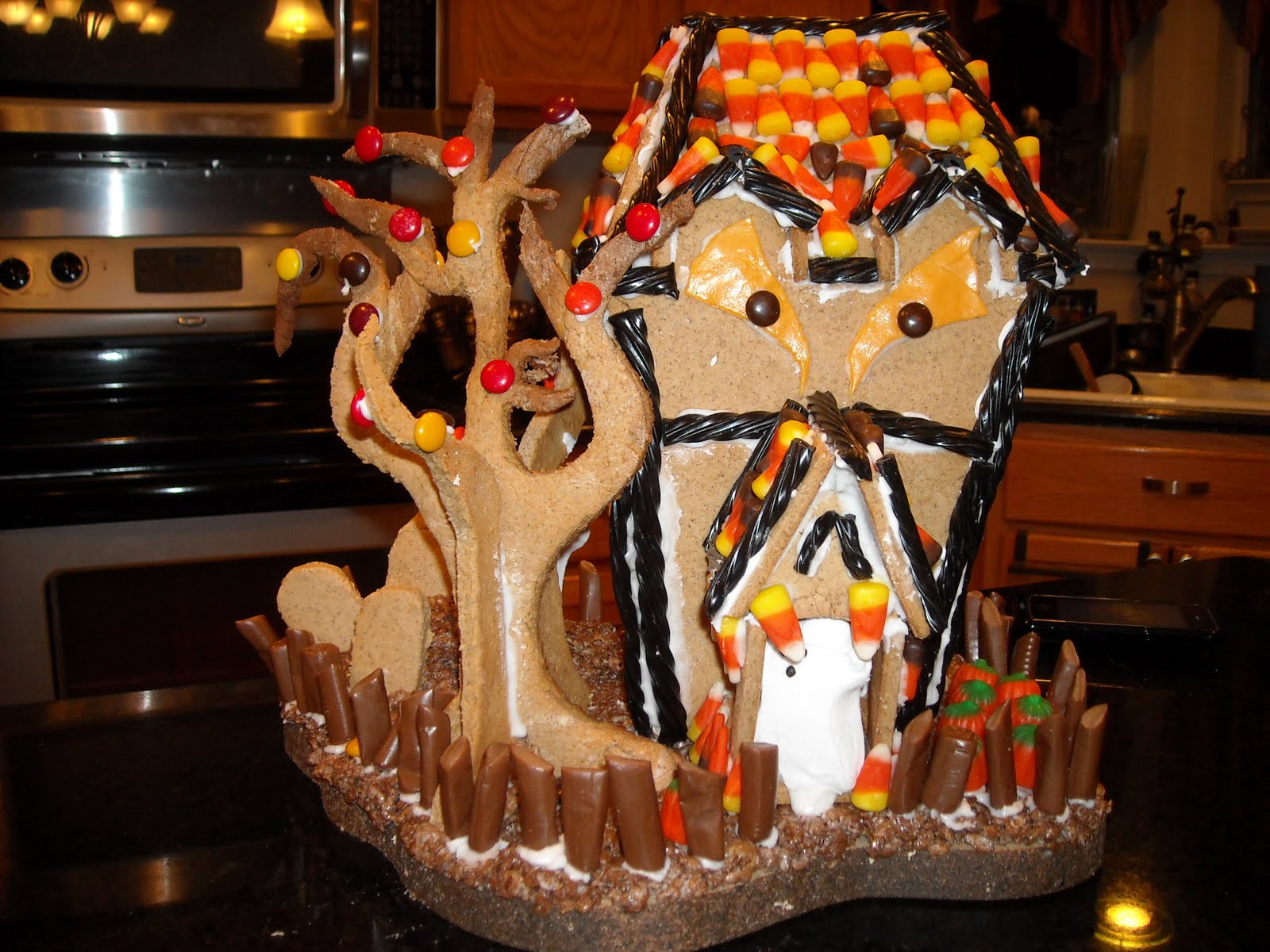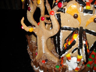 candy corn roof tilesTootsie Toll fencefall colored M&Ms and Reeces Pieces leaves on a gingerbread treelicorice trimmarshmallow creme pumpkin patchCocoa Rice Crispy treat molded into place for the "fall lawn"ghost Peep occupants