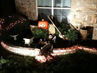 And...just 'cause...here's a picture of my front flowerbed, all decorated for Halloween. Note how the skeleton has busted through the brick border. And yes, that's the tombstone that usually sits in my office. ;)