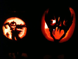 This year's pumpkins! It's always hard to get a good shot of them lit. Mine is on the left, and #1's is on the right. Mine is from a pattern, his is freehand. What do you think? And, of course, we cleaned and toasted the pumpkin seeds using this recipe.