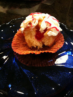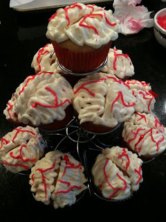 These are our blood clot cupcakes. The frosting is supposed to be tinted to look like gray matter, but we forgot to do that. So #1 added the veins! The recipe is here. Gross, huh? ;)