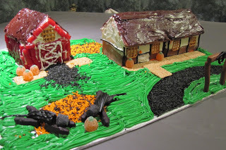 And the Grand Prize winner (a signed copy of Alpha and the Godiva chocolate lollipops) is this gingerbread model of the Lazy S Ranch! But for the record, it was chosen not for the subject matter but for the detail! Red barn, circle drive, green frosting grass, windows with bars, Lazy S gate made of Tootsie Rolls, and even the licorice werecats (Faythe and Marc, I'm told) sharing their Halloween pumpkin. Number 1 and I love it!