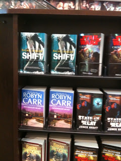 Yesterday I saw Shift on the top rack of the new release display at my local Barnes and Noble! It's still nine days until the official release, and I hope to have some release goodies for you very soon, but some stores already have the book on the shelf. Including the B&N at La Cantera, in San Antonio, where I left a bunch of signed copies.Yesterday was kind of insane, in the best possible way. I had lunch/dessert/coffee with a friend, signed books at B&N, wrote 3,700 words (chapter 7) on MS...