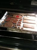 Here are some of the pieces in the oven. The window cutouts are filled with crushed cherry Lifesavers. I usually use Jolly Ranchers, and I'll be going back to those next year, because ...