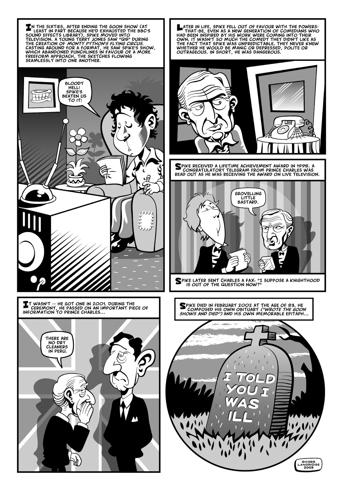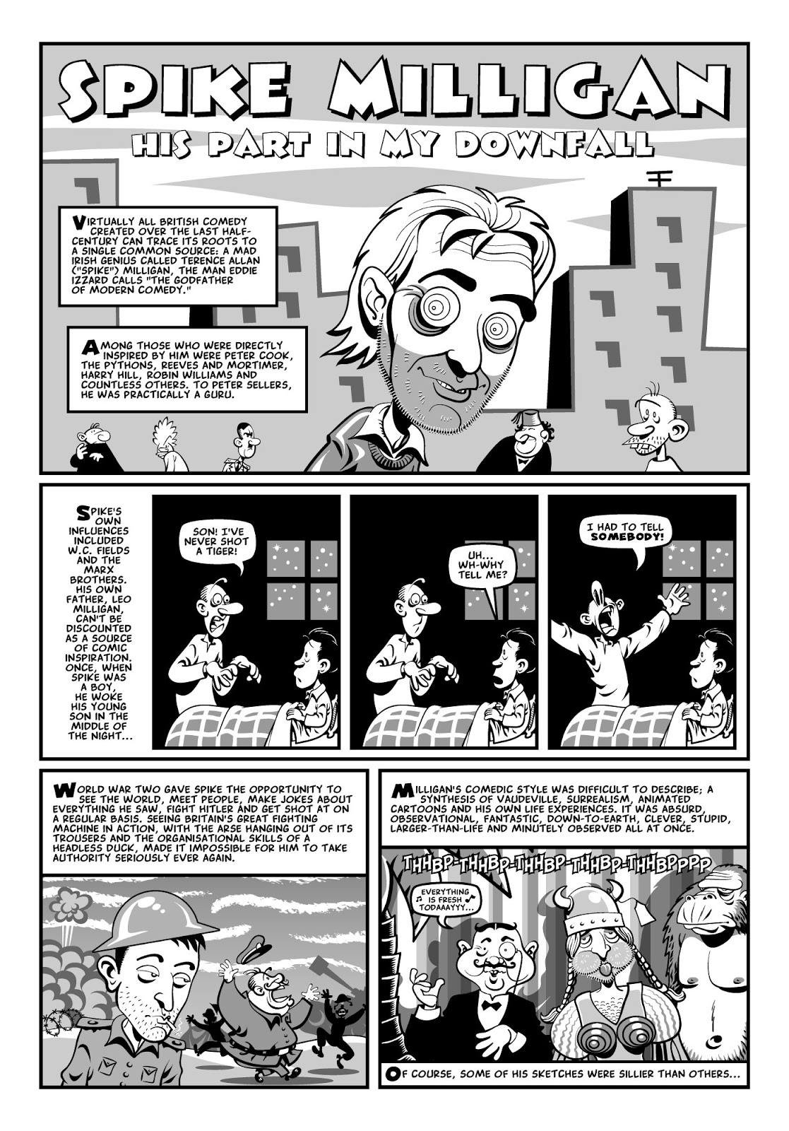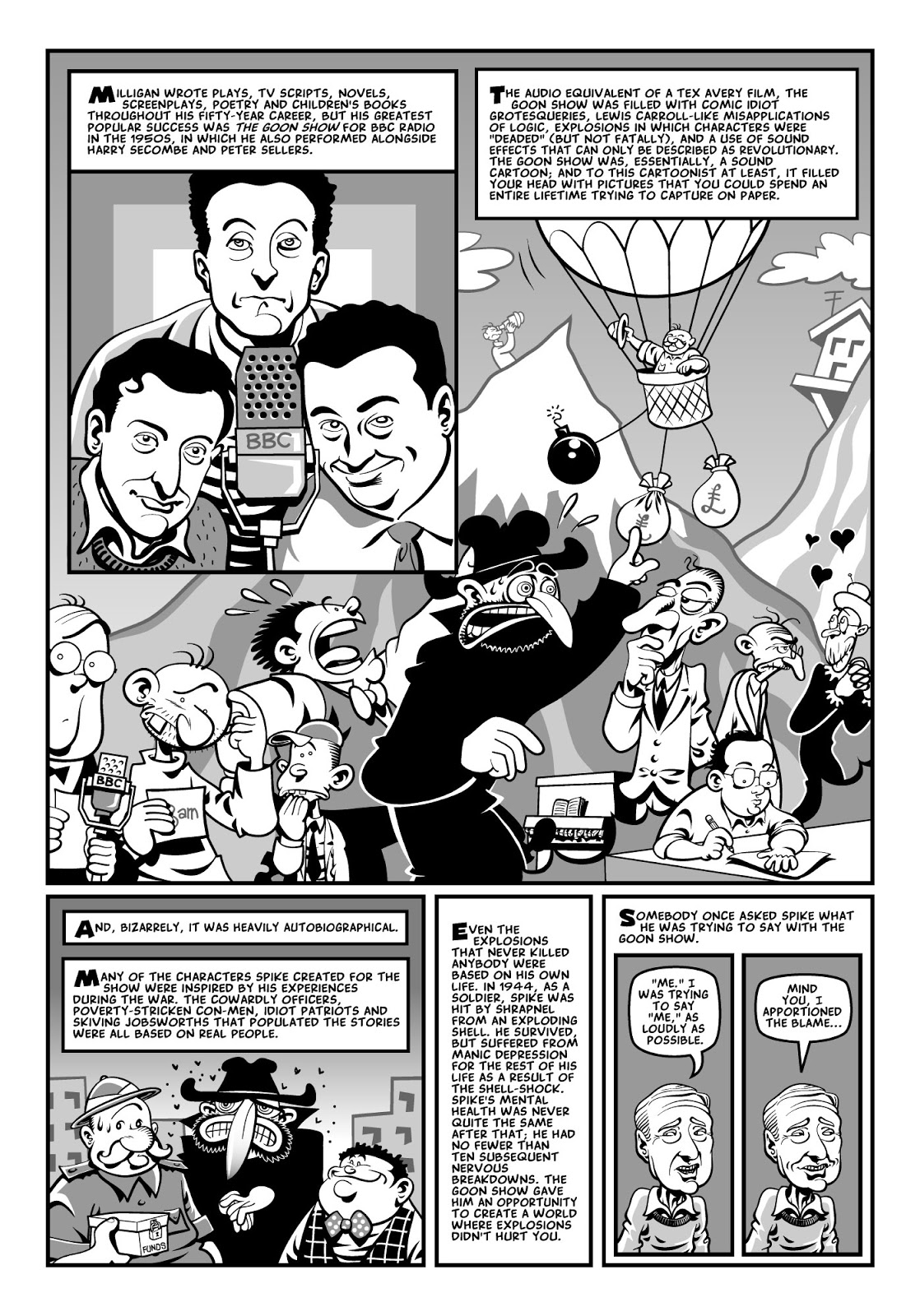 Spike Milligan, the greatest British comic talent of the 20th century*, would have been 100 years old today. So I thought I'd post this three-pager I did in 2003 for an anthology called Spark Generators, the theme of which was for cartoonists to draw a piece about an artist who had inspired them and their work.