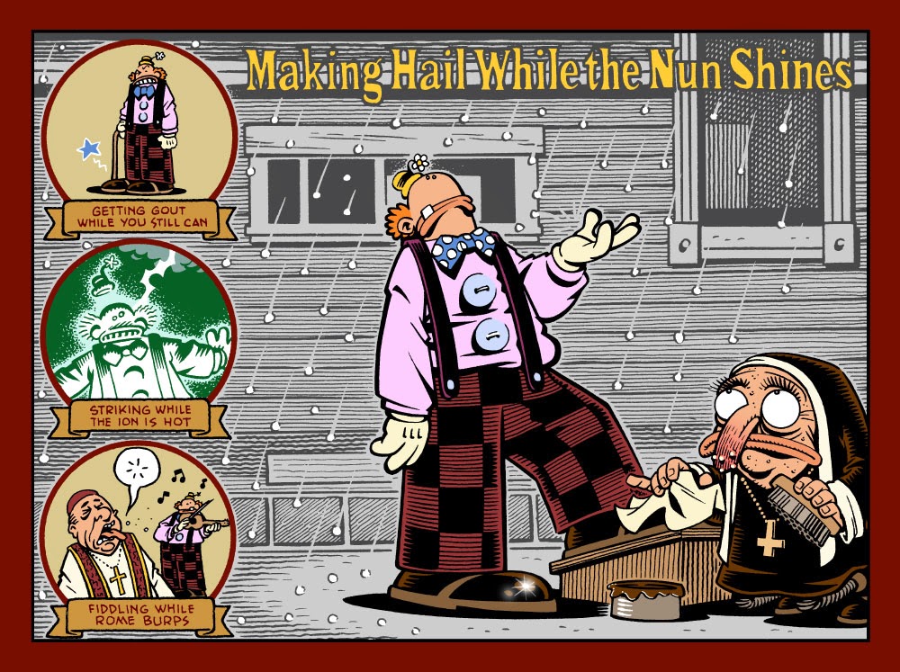 This one was originally a companion piece to a strip that passed muster for the collection, Returning a Deaf Ear. I think throwing Knuckles the Malevolent Nun in there was a tad self-indulgent...