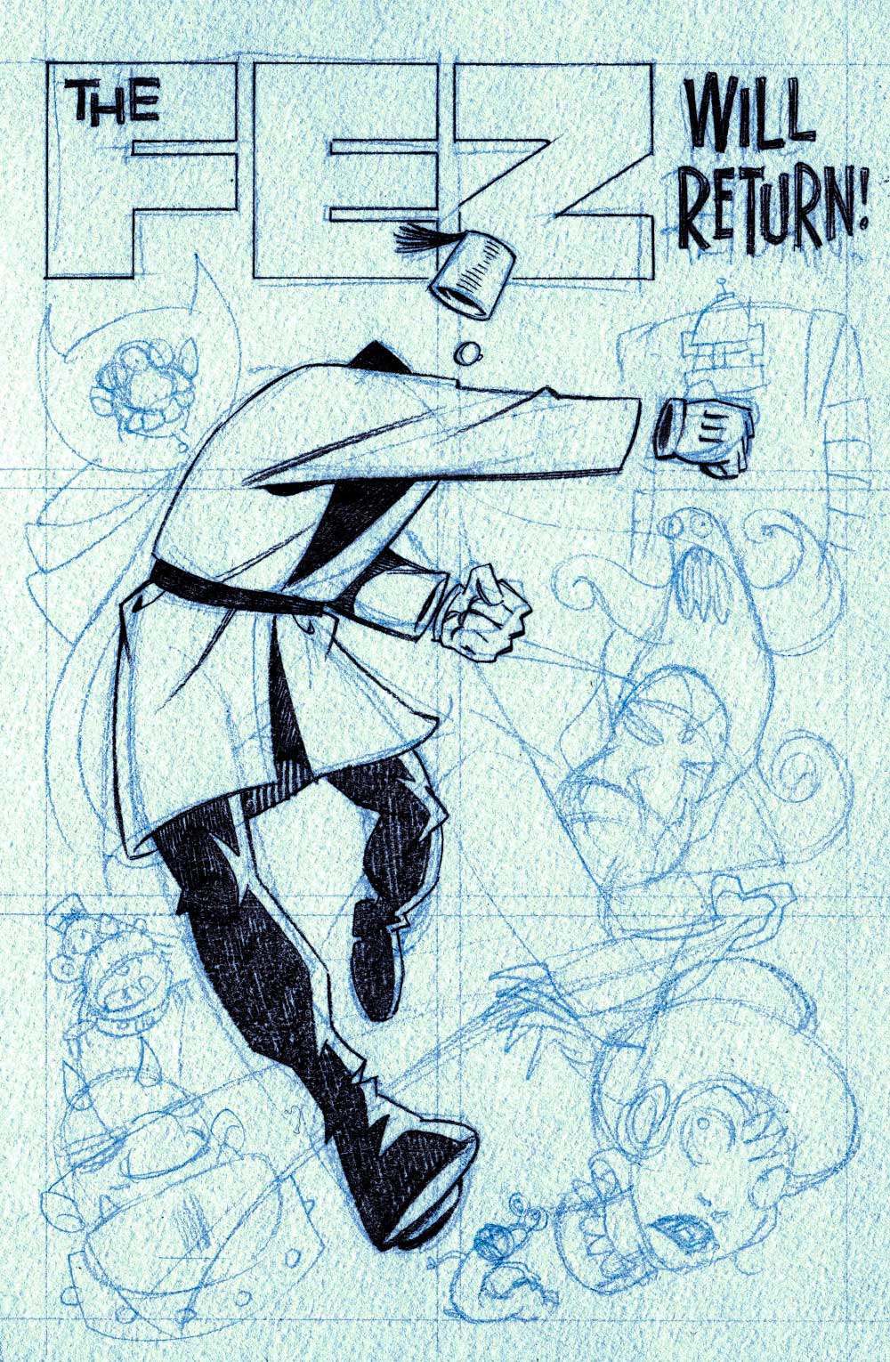 (3) A Fez mini-comic. My first Fez story, in Aces Weekly , seemed to be well-received, so I'm doing more of that, both for Aces and for myself. It's starting to coalesce into something I'm rather pleased with. So I'm plugging away at a mini-comic that I intend to have ready for the 2D Festival in Derry at the end of this month. Here are pencils for the cover.