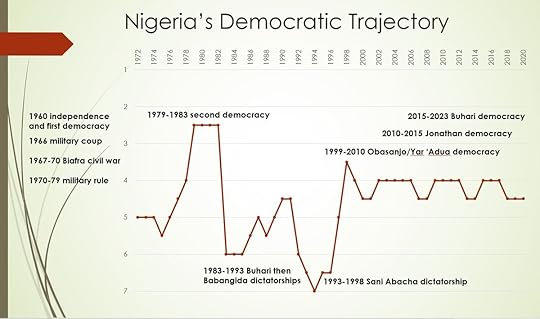 Out of the news, but immensely significant: Nigeria's national election is 79 days away. 90 million registered voters, fully electronic, and of pivotal importance for African democracy. Nigeria's @freedomhouse democracy score (inverted) below. Pray for @in