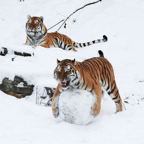Five-year-old Siberian tigers Wassja and Mandschu play with a giant snow ball at Wuppertal Zoo in Germany. Picture: BARBARA SCHEER / ANIMAL PRESS / BARCROFT MEDIA