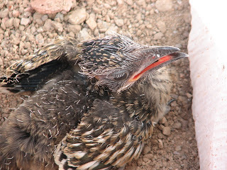 The following excerpt documents an emotionally inspiring experience I had with a roadrunner pair that nested in our house-under-construction. I just happened to be outside when I heard the faint clack clacks of the first grounded fledgling: