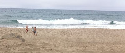 So I thanked the surfer and shepherded my kids down the beach to the suggested place where the waves looked more like Cayman when a Northwester blows in, decent surf, but predictable, waves that come in straight, break and go out. I let the boys wade in and get tumbled in the chilly water. Max took a few spins in the break, got some sandburn on his shoulders and abandoned body surfing for beachcombing but Hayden stayed in until he was blue-lipped, shrieking with joy and taunting, waggling his surf-shorted bum at the waves that rolled in and summarily took him down.