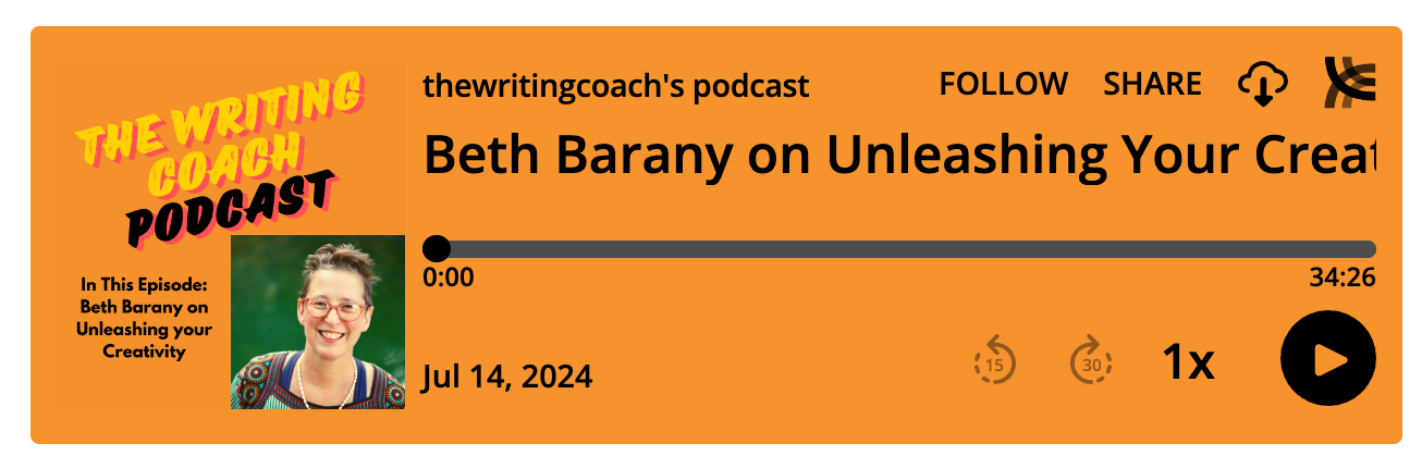 [00:34] Intro to Part 2 The Importance of Writing Support Groups and Your Writing ProcessBETH BARANY: I just wanna underscore for everybody listening, ’cause I’m a writing teacher and a coach and I run my own groups, how important it is that we have support groups and I love that you have your in-person groups, you have your online groups. As many groups as you can handle is what I recommend people do. Places where they get to be with their peers, you get to be with your peers. You’re running a group, which also allows you to learn in a new way. And we learn from our peers, we learn from our students, we learn from our mentors, and which can come in all kinds of forms. I’m really pleased that you’re doing that, and also just to model for other people who might be struggling.