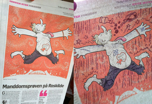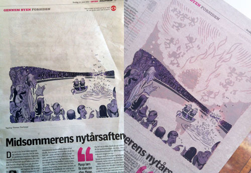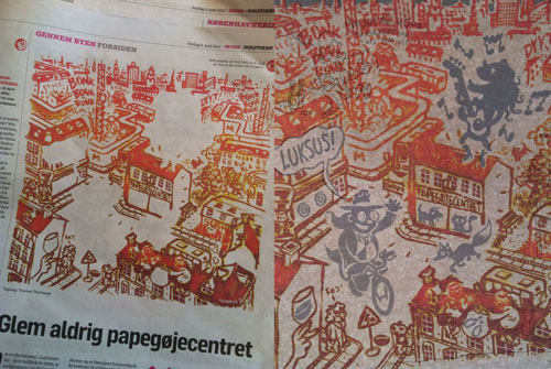 En anden lille ting, jeg har været så priviligeret at få lov at lege med, er Politiken-tillægget iBYENs nye tricktegning ‘Gennem byen’, lanceret af den hyperkreative layouter Liv Ajse. Der er tale om et indslag, der KUN giver mening på papir, og det er naturligvis intenderet. I sin korthed er konceptet en illustreret klumme, men hvor illustrationen får nye nuancer når siden holdes op mod lyset. Det er et koncept, man måske husker fra visse børnebøger, men som her er et fast, tilbagevendende indslag hver fredag (geniet Philip Ytournel har lavet de øvrige indslag indtil videre). Det er sjovt at planlægge, men hulens svært at lave en bagside, der altså ikke blot leverer nye detaljer til forsiden, men som også skal kunne fungere acceptabelt i sig selv…