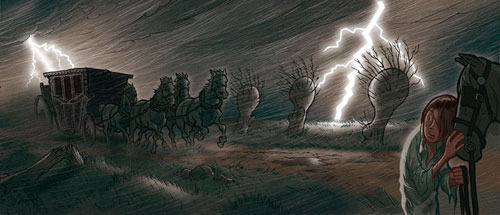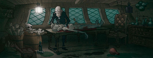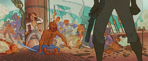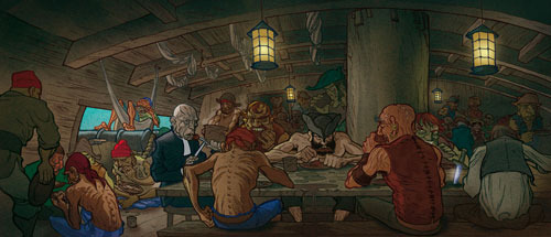 For dem, der er bekendte med hvad jeg ‘normalt’ går og laver, ser illustrationerne nok lidt anderledes ud. Det, missionen drejede sig om, var imidlertid helt klar: jeg ville prøve at tegne en bog, jeg selv ville elske at læse da jeg var 11-14 år gammel – så der skulle skrues op for production value og ned for cartoon-minimalisme, og jeg gik klart efter at fremmane nogle af de kvaliteter, som de store, kulørte piratmalere Howard Pyle og N. C. Wyeth i sin tid mestrede så virtuost – i mine egen ydmyge udgave, naturligvis.